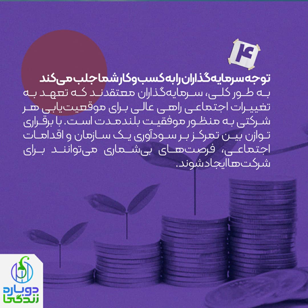 به طور کلی، سرمایهگذاران معتقدند که تعهد به تغییرات اجتماعی راهی عالی برای موقعیتیابی هر شرکتی به منظور موفقیت بلندمدت است. با برقراری توازن بین تمرکز بر سودآوری یک سازمان و اقدامات اجتماعی، فرصتهای بیشماری میتوانند برای شرکتها ایجاد شوند.