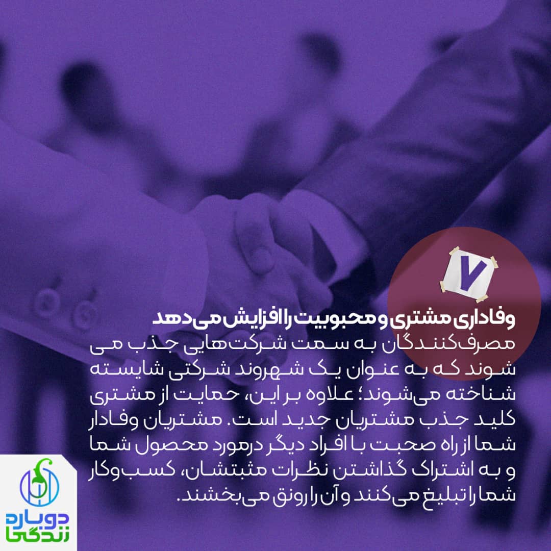 مصرفکنندگان به سمت شرکتهایی جذب میشوند که به عنوان یک شهروند شرکتی شایسته شناخته میشوند؛ علاوه بر این، حمایت از مشتری کلید جذب مشتریان جدید است. مشتریان وفادار شما از راه صحبت با افراد دیگر درمورد محصول شما و به اشتراک گذاشتن نظرات مثبتشان، کسبوکار شما را تبلیغ میکنند و آن را رونق میبخشند.